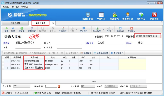 參數(shù)設(shè)置完成后,打開“采購(gòu)管理”,新增一個(gè)采購(gòu)入庫(kù)單,單據(jù)保存并審核,如下圖所示: