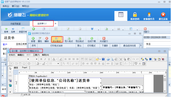 功能導航窗點擊“業務處理”—》“新開送貨單”,新增并保存一張送貨單單據,工具欄“打印”下點擊“打印格式設計”,在打印格式設計界面選擇模板點擊“設計格式”進入打印模板設計器界面,示例模板:送貨單打印模版(B02),如下圖所示: