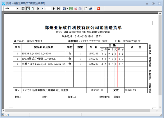 新開(kāi)送貨單確認(rèn)保存,默認(rèn)打印模板預(yù)覽界面如下圖: