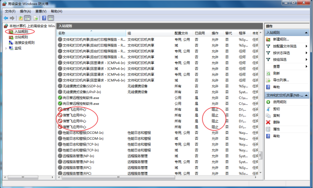 打開“控制面板”→“系統(tǒng)和安全”→“Windows防火墻”→“高級(jí)設(shè)置”→“入站規(guī)則”,把被阻止的應(yīng)用服務(wù)程序刪除掉,然后重新添加端口到防火墻即可。