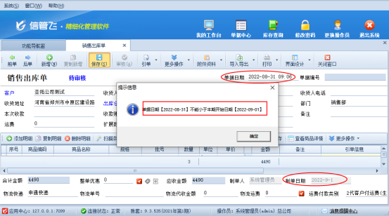 信管飛RMS專業版軟件在補錄之前日期單據保存時,提示以下消息“單據日期【2022-08-31】不能小于本期開始日期【2022-09-01】”,如下圖所示,出現此提示該如何解決?本文進行示范操作。