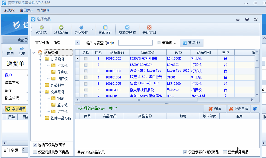 信管飛送貨單軟件開(kāi)送貨單前可提前添加好商品信息到基礎(chǔ)資料中,新開(kāi)送貨單選擇客戶后,選擇“添加明細(xì)”可彈出選擇商品界面,可選擇添加好的商品信息,有用戶反映在選擇商品界面,查詢窗口輸入商品簡(jiǎn)寫(xiě)不自動(dòng)過(guò)濾,需要點(diǎn)擊下查詢才會(huì)進(jìn)行檢索,如下圖所示:
