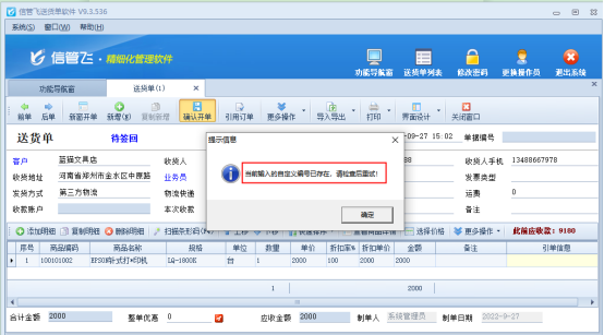 信管飛系列軟件支持開(kāi)單保存自動(dòng)生成對(duì)應(yīng)的單據(jù)編號(hào),同時(shí)軟件支持開(kāi)單錄入自定義編號(hào)(訂單合同號(hào)),有用戶存在多張單據(jù)使用相同訂單合同號(hào),但保存第二張單據(jù)時(shí)提示“當(dāng)前輸入的自定義編號(hào)已存在,請(qǐng)檢查后重試!”,如圖: