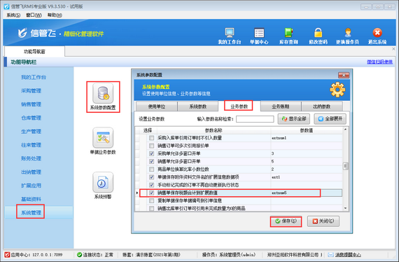 在功能導(dǎo)航窗點(diǎn)擊“系統(tǒng)管理”—》“系統(tǒng)參數(shù)配置”—》“業(yè)務(wù)參數(shù)”打開業(yè)務(wù)參數(shù)配置界面,在“業(yè)務(wù)單據(jù)相關(guān)參數(shù)”內(nèi)啟用參數(shù)“銷售單保存稅額合計(jì)到擴(kuò)展數(shù)值”,并設(shè)置參數(shù)值,默認(rèn)是“extnum5”(單據(jù)主體.擴(kuò)展數(shù)值5)。