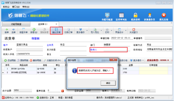 信管飛送貨單軟件、信管飛rms、信管飛倉庫管理軟件等支持開銷售單錄入收貨人信息,便于查詢單據商品是哪位客戶收到的貨物。也有客戶不需要開單時候輸入收貨人,對于不需要錄入收貨人信息的需求,軟件設置是否為必填項來進行控制收貨人是否為空顯示。