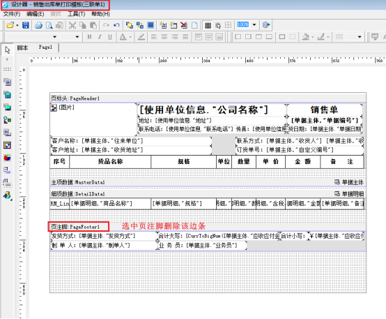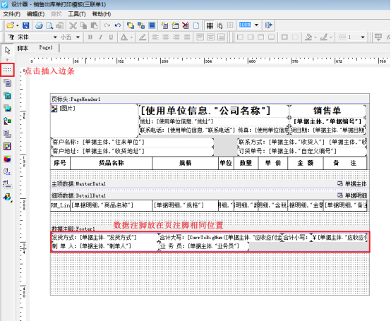 導(dǎo)航欄選擇“業(yè)務(wù)處理”—》“新開訂單”—》打印—》打印格式設(shè)計—》設(shè)計格式,進(jìn)入打印模板的設(shè)計器界面,選中“頁注腳”刪除該邊條,在該位置添加數(shù)據(jù)注腳,如下圖所示: