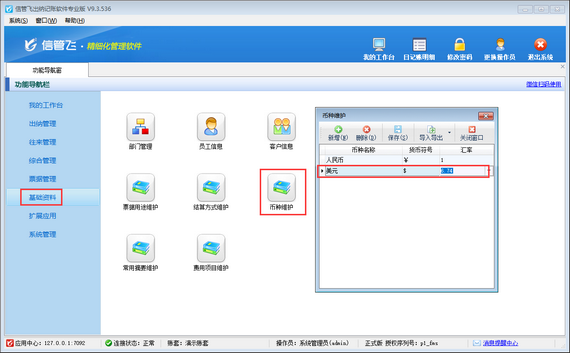 首先進行幣種設置,在軟件功能導航窗點擊“基礎資料”—》“幣種維護”打開幣種維護窗口,可設置幣種名稱、貨幣符號以及匯率信息,如圖所示,設置幣種“美元”、匯率為6.74,1美元 = 6.74人民幣。