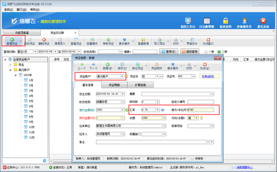 如登記日記賬時選擇的是外幣賬戶,新增憑證信息窗口可自動顯示“匯率”及“(本位幣)金額”信息,錄入原幣金額后,系統(tǒng)可自動計算本位幣金額。