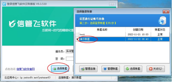 打開云賬套登錄界面,點(diǎn)擊“選擇賬套”,繼續(xù)點(diǎn)擊下一步進(jìn)入選擇登錄賬套界面,如下圖所示: