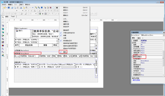 導(dǎo)航欄選擇“業(yè)務(wù)處理”—》“新開訂單”—》打印—》打印格式設(shè)計(jì)—》設(shè)計(jì)格式,進(jìn)入打印模板的設(shè)計(jì)器界面,選中細(xì)項(xiàng)數(shù)據(jù)空白處,右鍵勾選顯示屬性,每頁記錄數(shù)內(nèi)輸入固定的數(shù)值,如下圖所示: