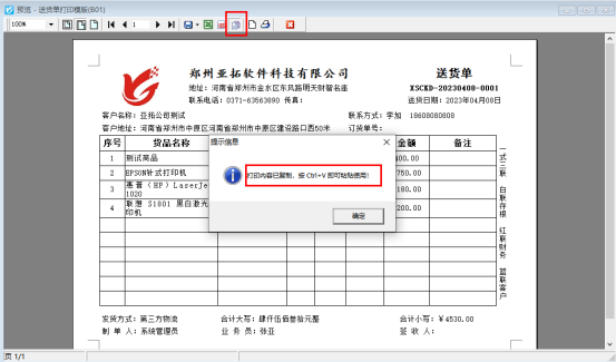 功能導航窗點擊“業(yè)務處理”—》“新開送貨單”,新增一個送貨單,確認開單后點擊打印下的打印預覽,進入模板預覽界面。在打印預覽界面左上角點擊“復制為圖片可在微信/QQ中直接粘貼”按鈕,提示“打印內容已復制,按Ctrl+V即可粘貼使用!”如下圖所示: