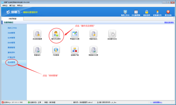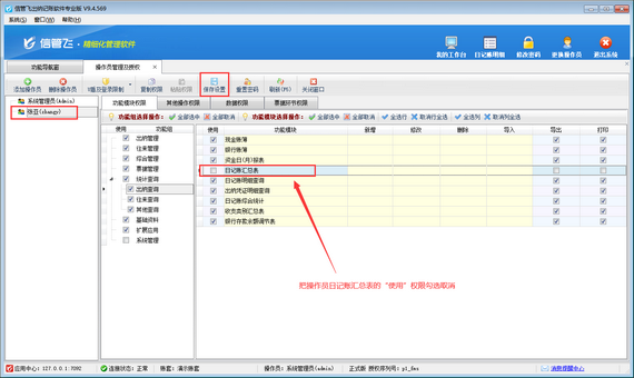 登錄軟件,在功能導航窗點擊“系統管理”—》“操作員及授權”,進入“操作員管理及授權”界面,選擇操作員“張亞”,在其右側的功能模塊權限內選擇“出納查詢”模塊,將日記賬匯總表的“使用”權限勾選取消,然后保存設置,如下圖所示。