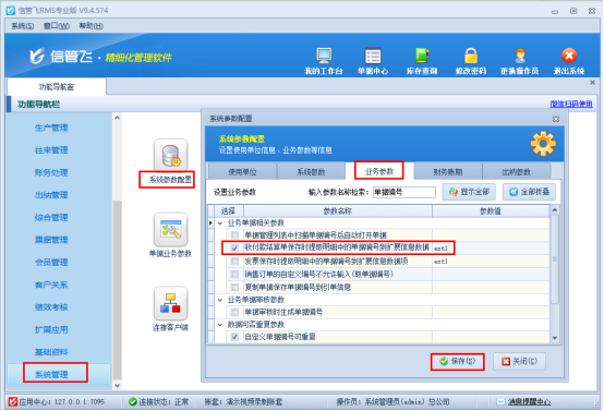 首先需要先啟用參數,在功能導航窗點擊“系統管理”—“系統參數配置”,選擇業務參數,找到參數“收付款結算單保存時提取明細中的單據編號到擴展信息數據項”勾選并保存參數配置,參數值默認是擴展信息1,可修改。如下圖所示:
