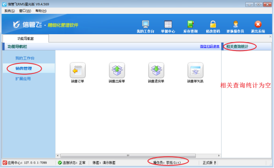 以操作員“李拓”為例,未設(shè)置操作員銷售管理相關(guān)查詢權(quán)限時(shí),操作員賬號登錄,銷售管理右側(cè)相關(guān)查詢?yōu)榭瞻祝疚囊?A title="" href="http://www.hjx188.com/erp/index.html">信管飛RMS軟件為例演示一下操作員賬號無法查看銷售管理相關(guān)查詢,如何解決?如圖所示: