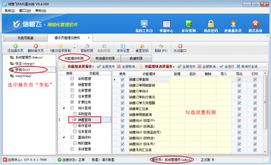 設(shè)置操作員權(quán)限:選中操作員“李拓”賬號,然后在功能模塊權(quán)限中勾選設(shè)置操作員銷售查詢功能(右側(cè)默認(rèn)全部勾選,不需要的權(quán)限可取消勾選),點(diǎn)擊保存即可,如圖所示: