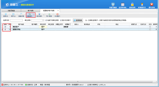 進(jìn)入批量維護(hù)客戶信息界面后,點(diǎn)擊“批量操作”進(jìn)入批量操作模式,打鉤選擇要批量設(shè)置所屬部門的客戶信息。