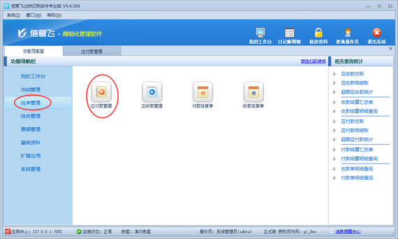 在功能導(dǎo)航窗點(diǎn)擊“往來管理”—》“應(yīng)付款管理”打開應(yīng)付款管理界面,如下圖所示。