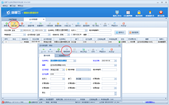 選擇需要被復(fù)制的房租應(yīng)付款信息,工具欄點(diǎn)擊“修改”按鈕,在打開的“修改應(yīng)付款信息”窗口點(diǎn)擊“復(fù)制新增”按鈕可復(fù)制生成一個(gè)一模一樣的應(yīng)付款信息,復(fù)制生成的新的應(yīng)付款信息需要修改后進(jìn)行保存,如下圖所示。