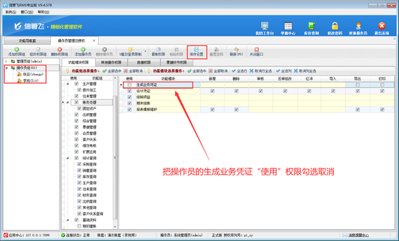 登錄軟件,在功能導航窗點擊“系統管理”—》“操作員及授權”,進入“操作員管理及授權”界面,選擇操作員“張亞”,在其右側的功能模塊權限內選擇“財務處理”,將生成業務憑證的“使用”權限勾選取消,然后保存設置,如下圖所示。