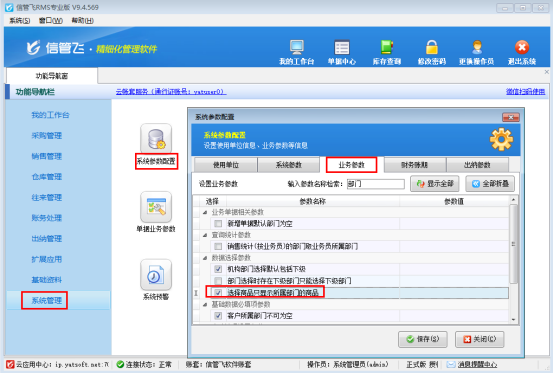 軟件默認不按部門顯示商品,需要按部門顯示需啟用參數(shù)配置,功能導航窗點擊“系統(tǒng)管理”—“系統(tǒng)參數(shù)配置”,點擊業(yè)務參數(shù),勾選參數(shù)“選擇商品只顯示所屬部門的商品”并保存配置,如下圖所示: