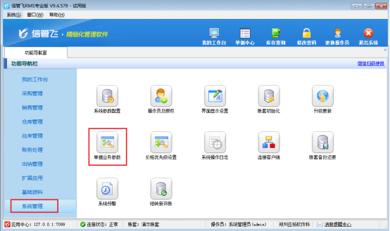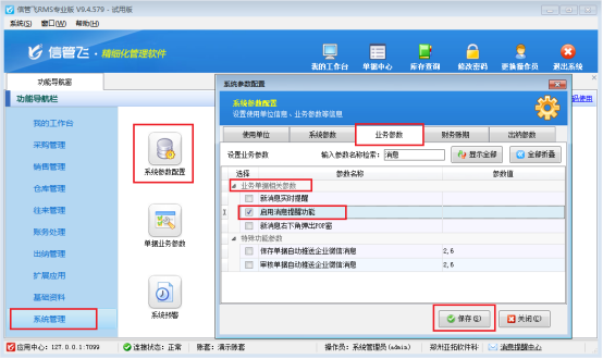 在功能導(dǎo)航窗點(diǎn)擊“系統(tǒng)管理”—》“系統(tǒng)參數(shù)配置”—》“業(yè)務(wù)參數(shù)”,業(yè)務(wù)單據(jù)相關(guān)參數(shù)下,打勾“啟用消息提醒功能”,保存設(shè)置,如下圖所示: