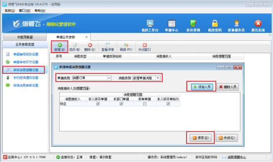 在功能導(dǎo)航窗點(diǎn)擊“系統(tǒng)管理”—》“單據(jù)業(yè)務(wù)參數(shù)”—》“審核消息提醒設(shè)置”,在此界面增加消息接收人員“張亞”及提醒范圍,如下圖所示: