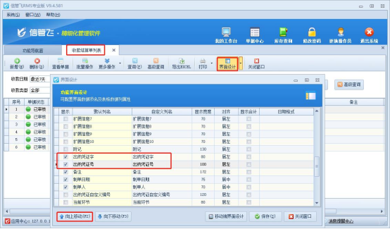 功能導(dǎo)航窗點(diǎn)擊“往來管理”—“收款結(jié)算單”進(jìn)入收款結(jié)算單列表界面,工具欄打開“界面設(shè)計(jì)”,勾選顯示“出納憑證字”“出納憑證號(hào)”,并點(diǎn)擊向上移動(dòng)至合適位置,保存界面設(shè)計(jì),如下圖所示: