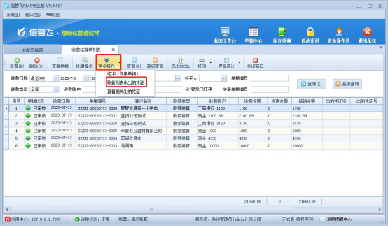 界面設(shè)計(jì)保存后在收款結(jié)算單列表界面顯示出“出納憑證字”和“出納憑證號(hào)”兩列,在工具欄更多操作下點(diǎn)擊“刷新列表中出納憑證”,刷新后在列表界面轉(zhuǎn)記過出納憑證的會(huì)顯示憑證字和憑證號(hào),顯示空白的則未轉(zhuǎn)記過出納憑證,如下圖所示: