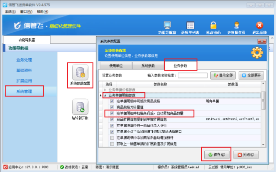 在功能導航欄,系統管理--系統參數配置--業務參數--業務單據明細參數下勾選參數“在單據明細中掃描條碼后,自動累加商品數量”,然后點擊保存,如圖所示: