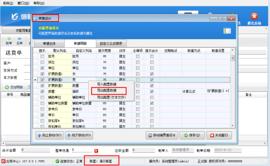 首先打開舊賬套“演示賬套”,功能導航窗點擊業(yè)務處理,打開“新開送貨單”界面,點擊工具欄界面設計,在界面設計界面鼠標單擊右鍵,彈出界面點擊“導出配置數(shù)據(jù)”,可導出配置文件至電腦桌面上,如下圖所示: