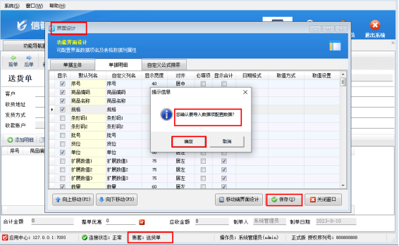 打開工具欄“界面設計”按鈕,鼠標右鍵選擇“導入配置數(shù)據(jù)”,選擇桌面上導出的配置文件,導入后提示信息點擊“確定”,導入完成保存界面設計,關閉界面設計,可看到開單界面配置已變?yōu)楹团f賬套配置一致。如下圖所示: