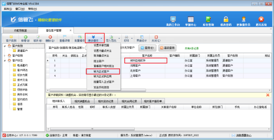 在潛在客戶管理界面選擇潛在客戶,點擊“更多操作”----轉為正式客戶,如圖所示: