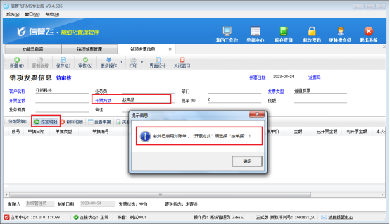 有用戶在填開發票時,會出現按商品無法填開發票的情況,系統提示“軟件已啟用對賬單,‘開票方式’請選擇‘按單據’!”,如下圖所示。