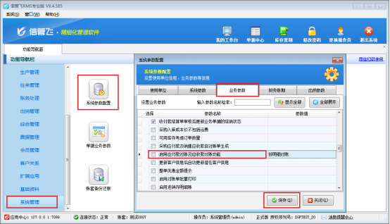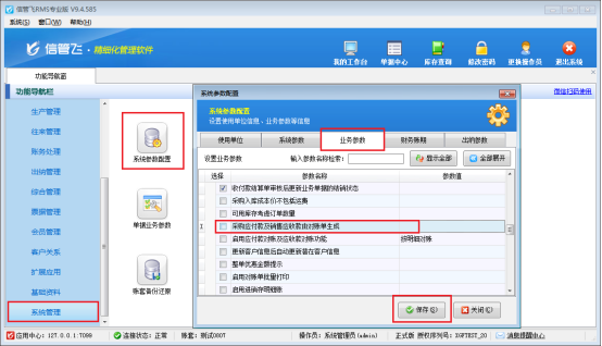 取消上述參數后再填開發票,系統如果還是提示相同信息,解決方法如下:在功能導航窗點擊“系統管理”—》“系統參數配置”—》“業務參數”打開業務參數配置界面,在特殊功能參數內找到并取消勾選參數“啟用應付款對賬及應收款對賬功能”,然后保存參數設置。