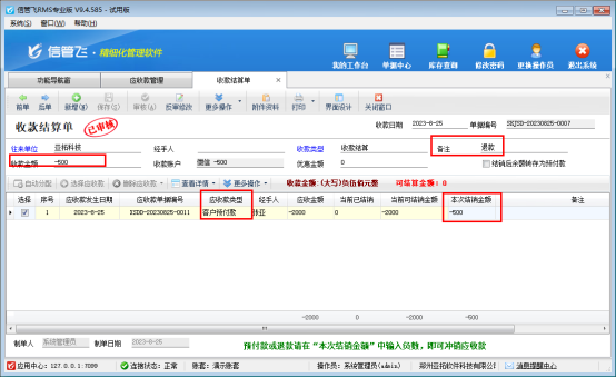 功能導航窗點擊往來管理—》應收款管理,選擇客戶預付款,點擊工具欄收款結算,在收款結算單界面。收款金額和當前可結銷金額輸入-500,可備注下退款,保存審核結算單就可以,如下圖所示: