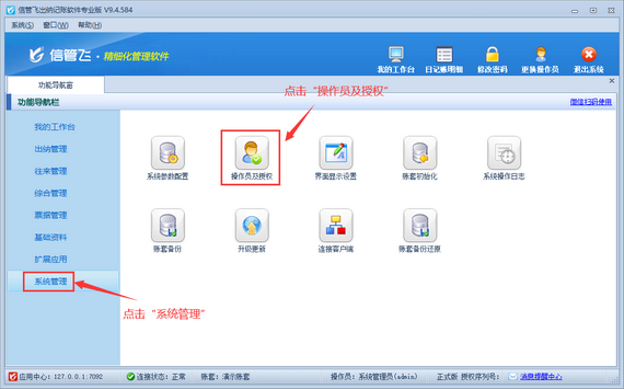 登錄軟件,在功能導航窗點擊“系統管理”—》“操作員及授權”,進入“操作員管理及授權”界面,選擇操作員“張亞”,在其右側的功能模塊權限內選擇“綜合管理”模塊,將員工借款管理的“修改”權限勾選取消,然后保存設置,如下圖所示。