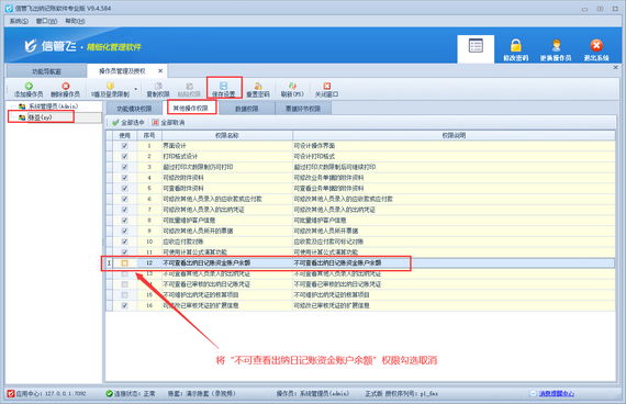 解決方法如下:使用系統(tǒng)管理員賬號(hào)登錄軟件,在功能導(dǎo)航窗點(diǎn)擊“系統(tǒng)管理”—》“操作員及授權(quán)”打開(kāi)操作員管理及授權(quán)界面,選擇操作員賬號(hào),在“其他操作權(quán)限”界面將“不可查看出納日記賬資金賬戶余額”權(quán)限勾選取消,然后保存權(quán)限設(shè)置,如下圖所示: