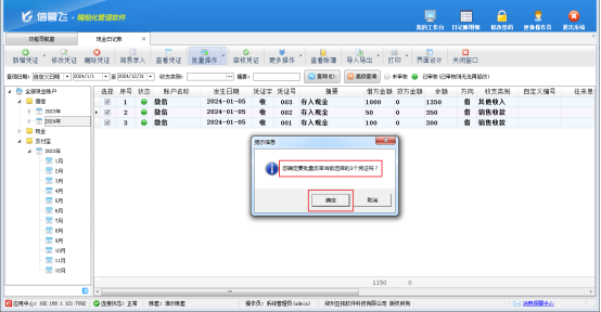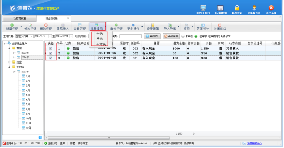 信管飛出納記賬軟件是一款集現(xiàn)金/銀行日記賬、應收應付款管理、工資管理、發(fā)票管理等為一體的綜合性財務出納管理軟件,軟件默認日記賬憑證審核后,不允許直接修改,有用戶在審核之后需要修改憑證,已審核狀態(tài)下無法進行修改,需要先反審憑證才能修改,如果需要修改的憑證過多,一個一個進行反審比較麻煩,為了提高效率,軟件內(nèi)支持批量反審憑證,本文以“信管飛出納記賬軟件”為例進行示范。