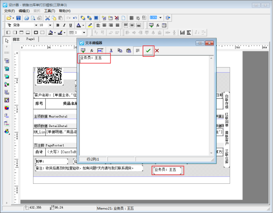 第一種情況:業務員名字固定顯示,雙擊打開添加的文本框,直接輸入內容,示例內容“業務員:王五”,之后點擊“√”確定,添加完成后預覽模板如下圖所示: