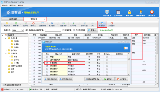 在功能導航窗點擊“業(yè)務處理”—》“送貨匯總表(按商品)”打開送貨匯總表(按商品)界面,然后在工具欄點擊“界面設計”,找到“商品擴展信息1”數(shù)據(jù)項,自定義列名修改為“顏色”并勾選顯示出來即可,如下圖所示。