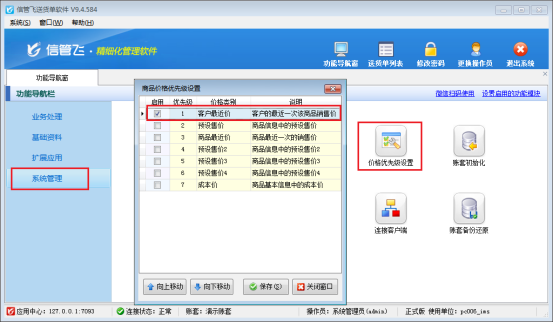 操作步驟:系統管理-----價格優先級設置,把預設售價設置為第1優先級,開單選擇商品時,單價獲取的是商品信息中已設置好的預設售價,如圖所示: