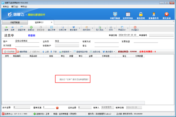 設(shè)置完成后,重新填開送貨單時,即可點擊“添加明細(xì)”按鈕直接添加明細(xì),如下圖所示。
