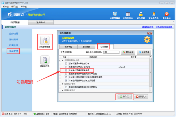 出現(xiàn)此問題的原因是,啟用了參數(shù)“送貨單必須通過引單生成”,解決方法如下:使用系統(tǒng)管理員賬號登錄軟件,在功能導(dǎo)航窗點擊“系統(tǒng)管理”—》“系統(tǒng)參數(shù)配置”—“業(yè)務(wù)參數(shù)”,找到并勾選取消參數(shù)“送貨單必須通過引單生成”,然后保存參數(shù)設(shè)置,如下圖所示。