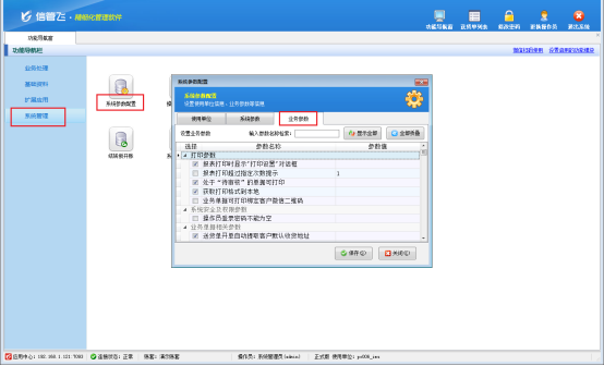 在功能導航窗點擊“系統(tǒng)管理”—》“系統(tǒng)參數(shù)配置”,點擊“業(yè)務參數(shù)”,在業(yè)務單據(jù)相關參數(shù)中勾選啟用“商品單位換算比率小數(shù)位數(shù)”參數(shù),并設置參數(shù)值,然后點擊“保存”按鈕保存參數(shù)配置,如下圖所示,設置商品單位換算比率小數(shù)保留5位顯示。