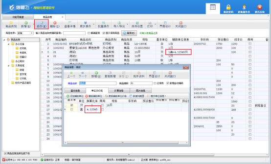 設置完成后,商品信息界面點擊修改,修改后重新進行保存,此時輔助單位信息即可保留5位小數(shù)顯示,如下圖所示。