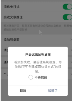 如果添加失敗,請打開手機(jī)系統(tǒng)設(shè)置,然后為微信打開“創(chuàng)建桌面快捷方式”的權(quán)限即可,如下圖所示。