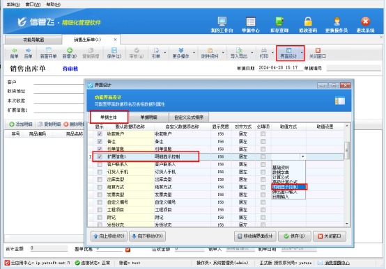 以“銷售出庫單”為例,在銷售出庫單界面,點擊工具欄“界面設計”,在單據主體中,勾選顯示“擴展信息1”,向上移動位置,修改自定義列名,取值方式選擇“單據明細控制”,如下圖所示: