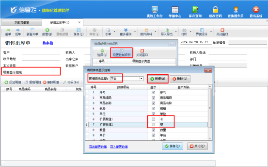 設置完成后,在開單界面選擇此項,在選擇界面點擊“設置控制項目”,可新增控制項目,根據控制項目分別配置顯示的數據項,如下圖所示: