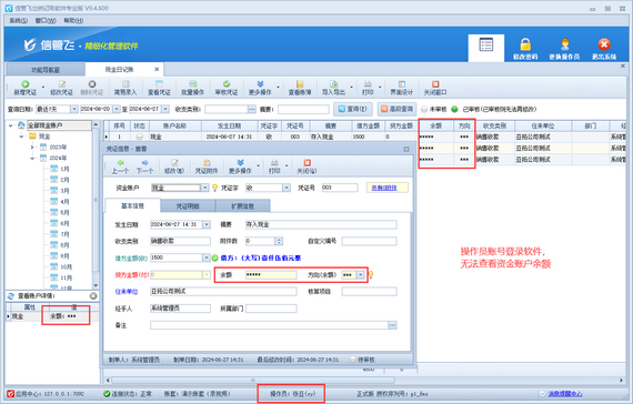 在資金賬戶余額管理方面,信管飛出納記賬軟件提供了嚴(yán)格的權(quán)限控制。企業(yè)可以設(shè)定特定操作員無法查看資金賬戶余額,從而有效防止敏感信息的泄露。這樣的設(shè)計(jì)不僅保護(hù)了企業(yè)的財(cái)務(wù)隱私,也增強(qiáng)了企業(yè)內(nèi)部的信任與協(xié)作。