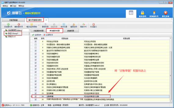 出現(xiàn)此問題的原因是:當(dāng)前登錄的操作員賬號(hào)沒有過賬單據(jù)的權(quán)限,解決方法如下:使用系統(tǒng)管理員賬號(hào)登錄軟件,在功能導(dǎo)航窗點(diǎn)擊“系統(tǒng)管理”—》“操作員及授權(quán)”打開操作員管理及授權(quán)界面,選擇操作員賬號(hào),在“其他操作權(quán)限”界面將“過賬單據(jù)”權(quán)限勾選上,然后保存權(quán)限設(shè)置,如下圖所示。